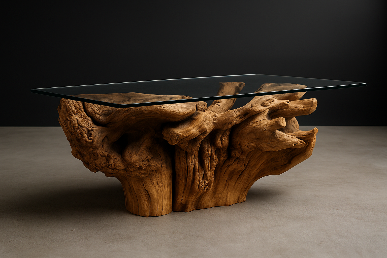 The rich tones of the root, paired with a thick crystal-clear glass top, create a seamless harmony of strength and elegance. Unrepeatable and timeless, this piece is 1 of 1—an heirloom of enduring beauty.