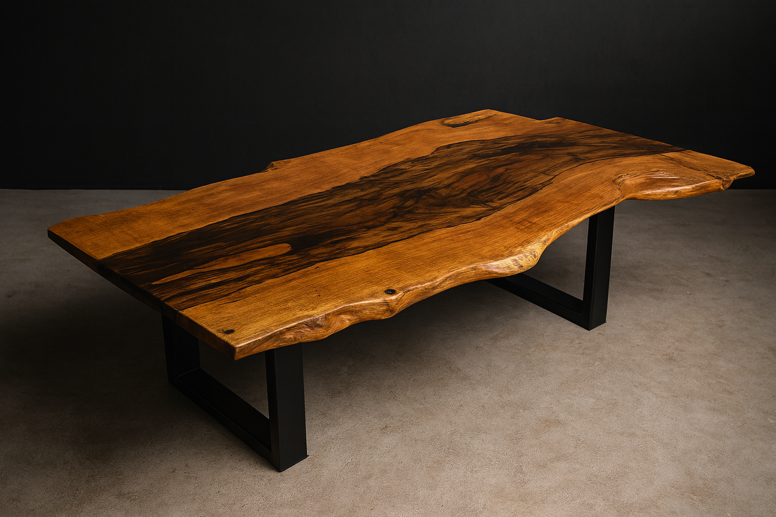 Crafted from the rare Golden Tepoina wood, this dining table radiates sophistication with its natural luster and rich dark bark. Its irregular live-edge curves give it the character of a sculptural artwork, ensuring no two pieces can ever be alike.